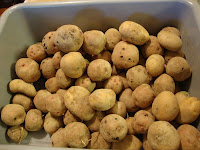 This was a good year for potatoes so we have only a small dishpan of itty bitty potatoes to deal with. Those won't last two weeks as I'll scrub a potful at a time, boil in their jackets and put them in the refrigerator for use in a baked dish like Doris' Golden Potatoes or make our favorite late morning breakfast -- home fries (cold boiled potatoes, sliced and fried) paired with garden tomatoes, cucumbers and onions in vinegar, plus farm fresh scrambled eggs with just-picked chives. Yum!